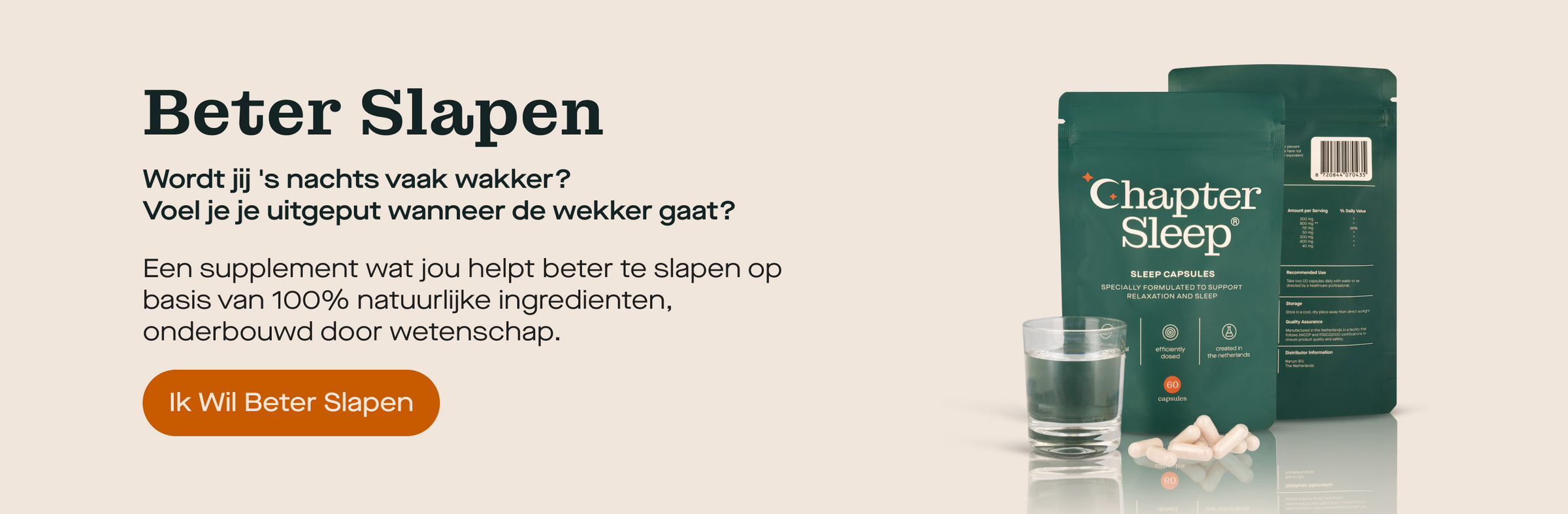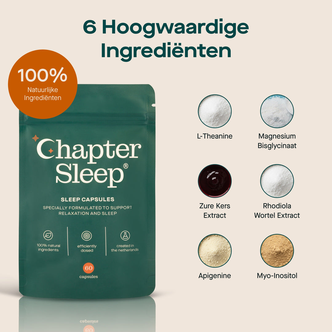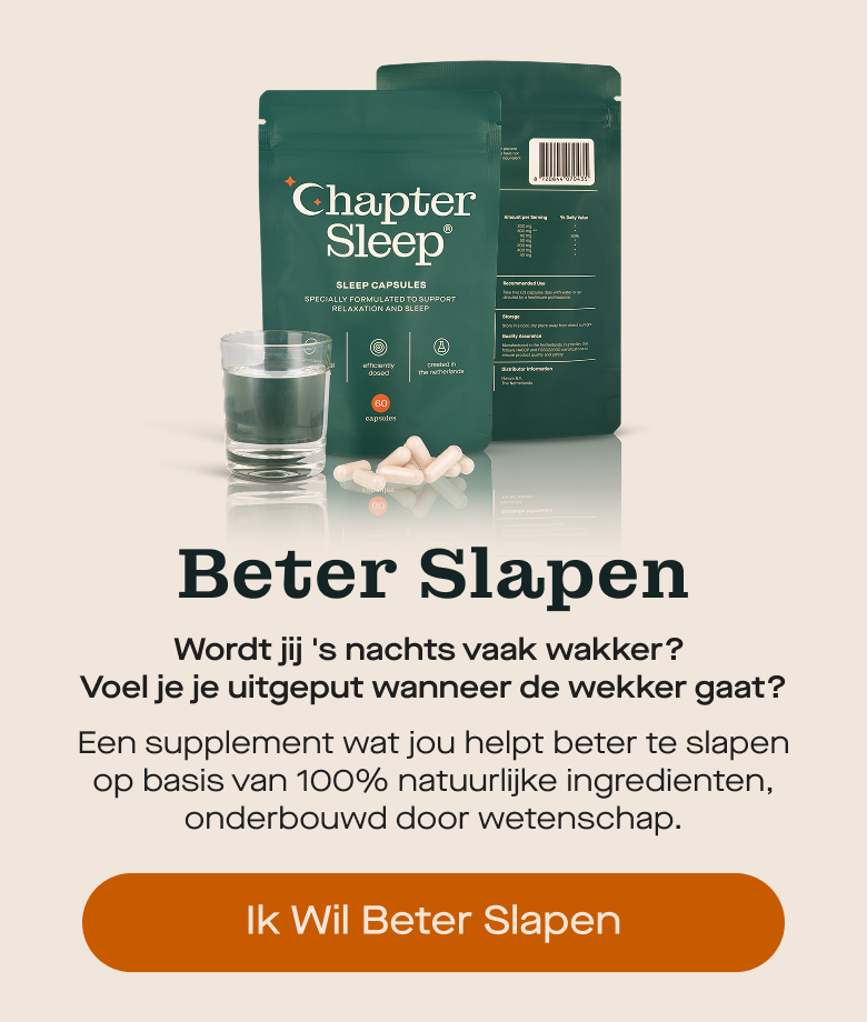 Verbeter de kwaliteit van jouw slaap. Chapter Sleep is het ultieme supplement om jou te helpen uitgeruster wakker te worden. 100% Natuurlijke ingredienten en gemaakt in Nederland.